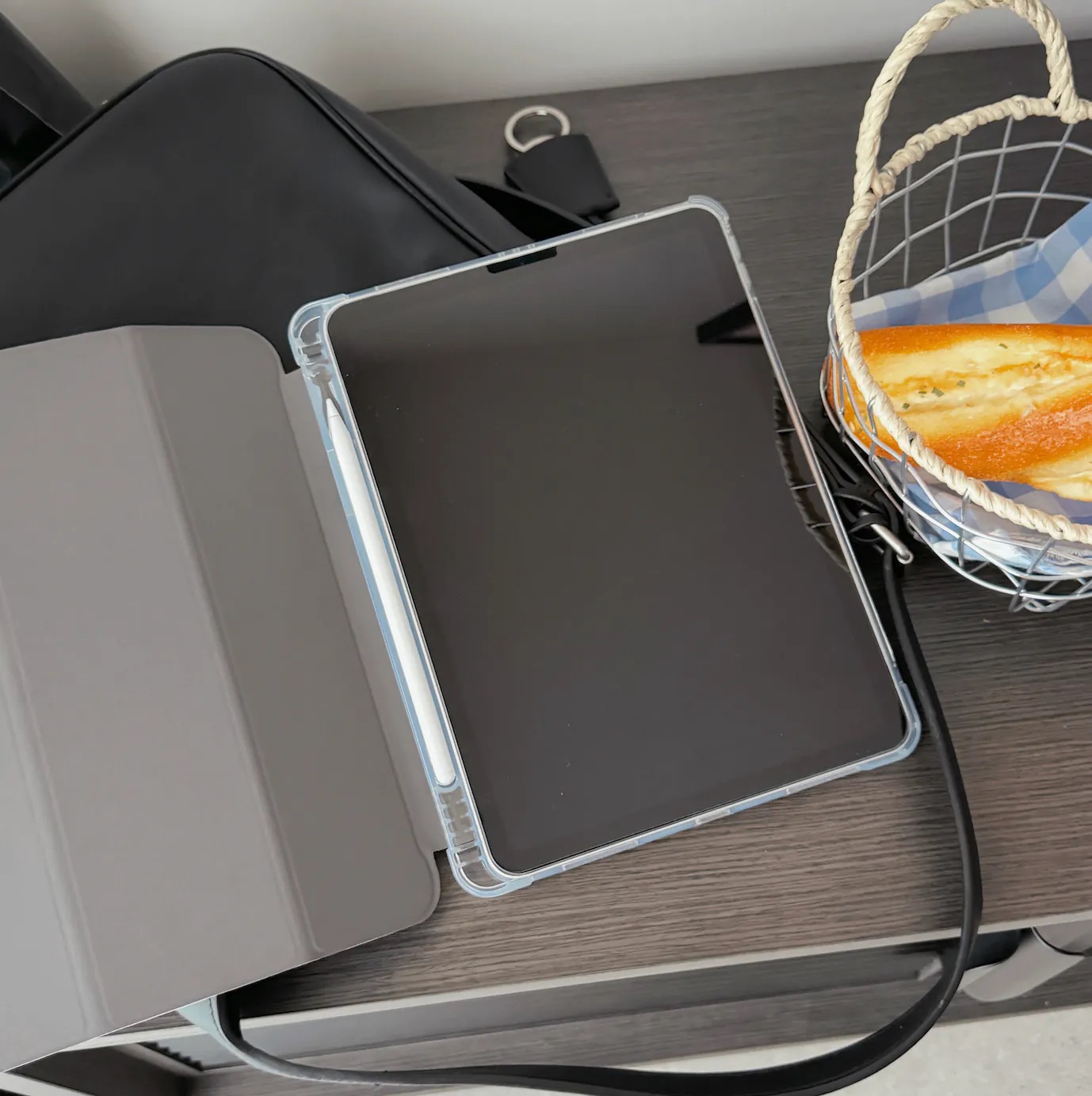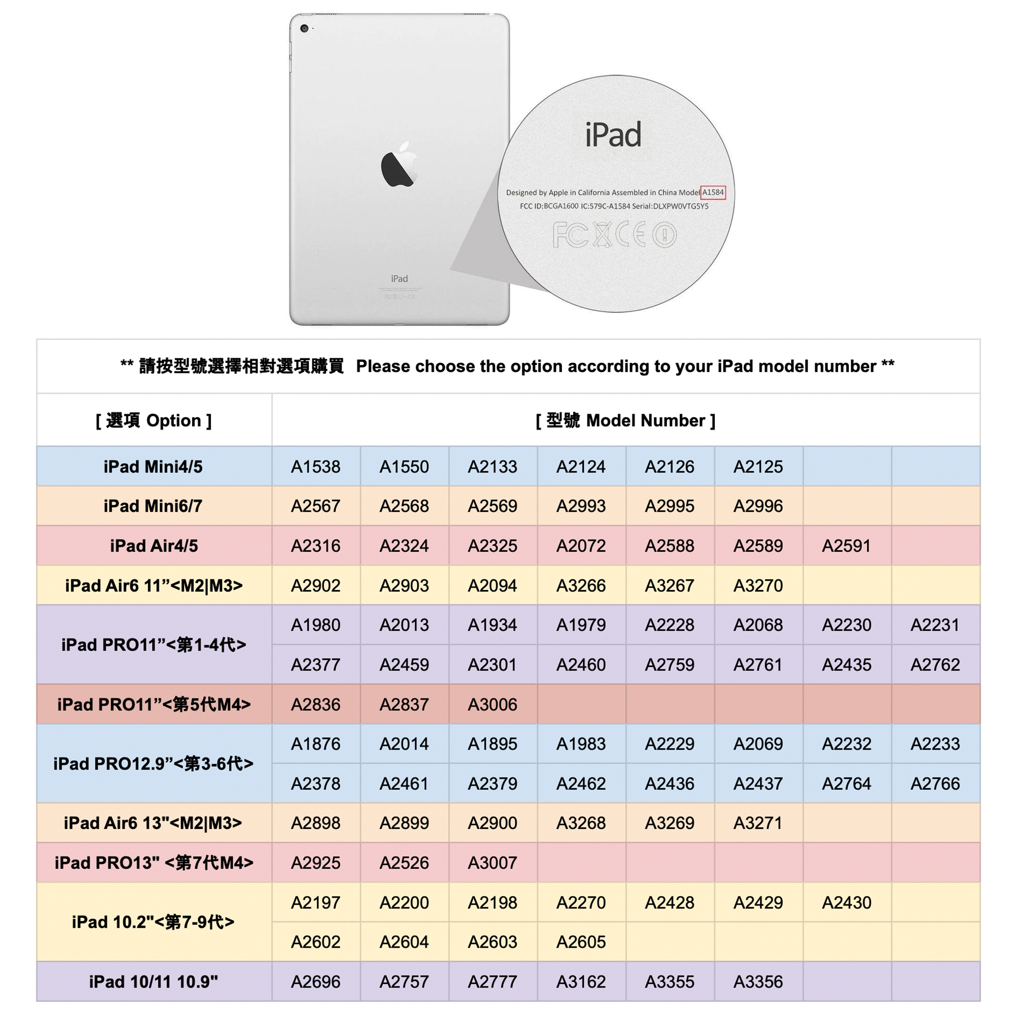 〖 更多細節 More Details 〗 ○ 覆蓋書本式設計 Book-style cover design ○ 面蓋|可摺起成三角狀以立起iPad方便觀看 Front cover|Can be folded into a triangular stand to prop up the iPad for easy viewing ○ 底蓋|磨砂半透明軟殻 更佳保護機身 Back cover|Matte semi-transparent soft case for better device protection ○ 物料|TPU及PU 耐用、易清潔打理 Material|TPU and PU, durable and easy to clean ○ 帶筆槽|可放置Apple pencil With pencil slot for Apple Pencil storage ○ 二代Appen Pencil可貼於iPad保護殼右側充電 The 2nd-generation Apple Pencil can magnetically attach to the right side of the iPad case for wireless charging *請對照機背Apple Logo下帶”A”開首的型號購買(例如:A1673、A2152), 不同型號不同尺寸,請務必先對清楚型號購買,以下附上對照表方便客人查看 Please refer to the model number starting with “A” located under the Apple logo on the back of the device (e.g., A1673, A2152). Different models have different sizes—please confirm your model before purchasing. A comparison chart is provided below for your reference *不同型號的尺寸和開孔位置都稍有不同,照片為大致效果, 實際尺寸和開孔位置會因不同型號而有不同,惟網站未能全部顯示,有需要可先查詢再購買,感謝 The size and cutout positions vary slightly between different models. Photos are for general reference only. Actual size and cutout positions will differ depending on the model, and not all variations can be fully shown on the website. If needed, feel free to inquire before purchasing. Thank you *請不要使用酒精擦拭產品※ Please do not clean the product with cleaners contain acetone or alcohol *此為訂購貨品 一般需預七至十四工作天備貨 This is pre-order item and generally take 7-14 business days to prepare