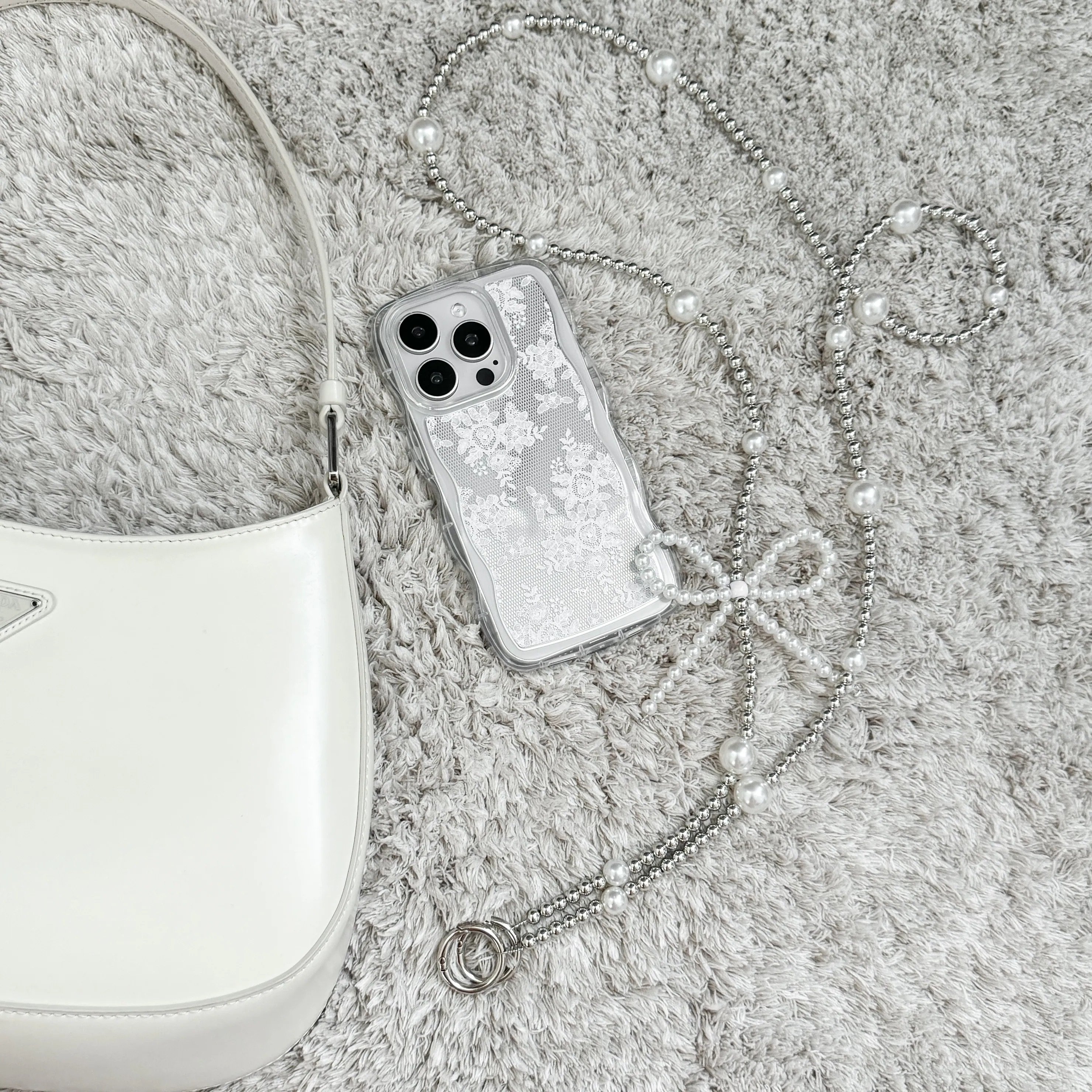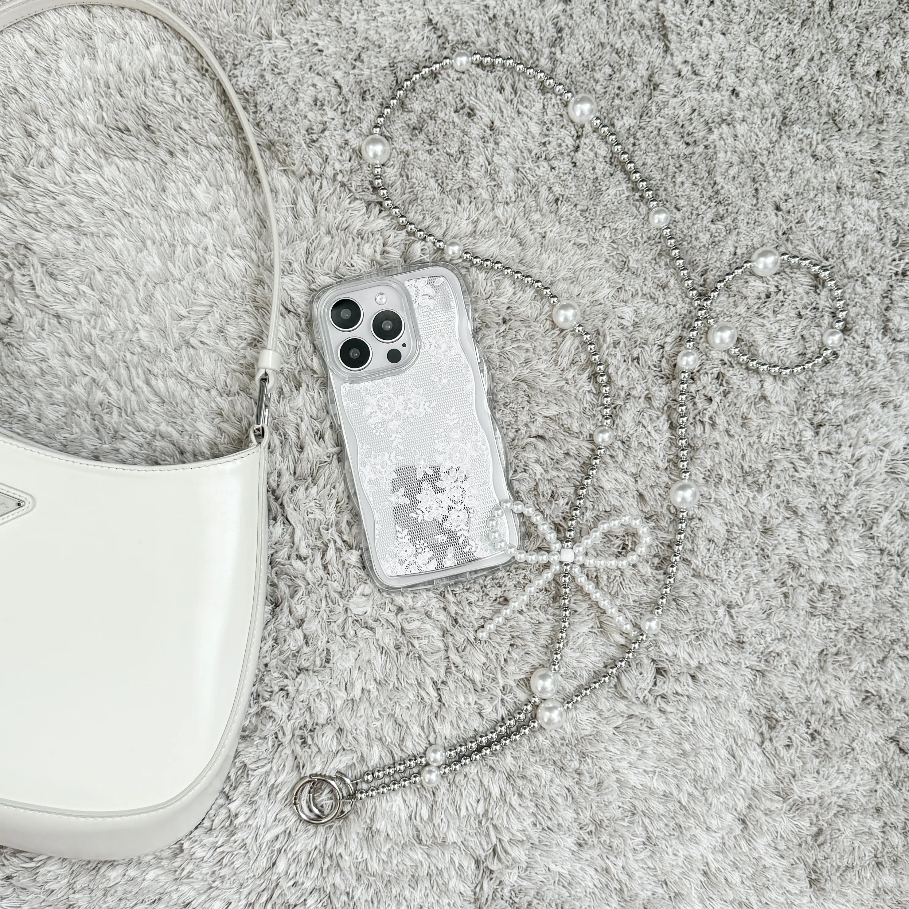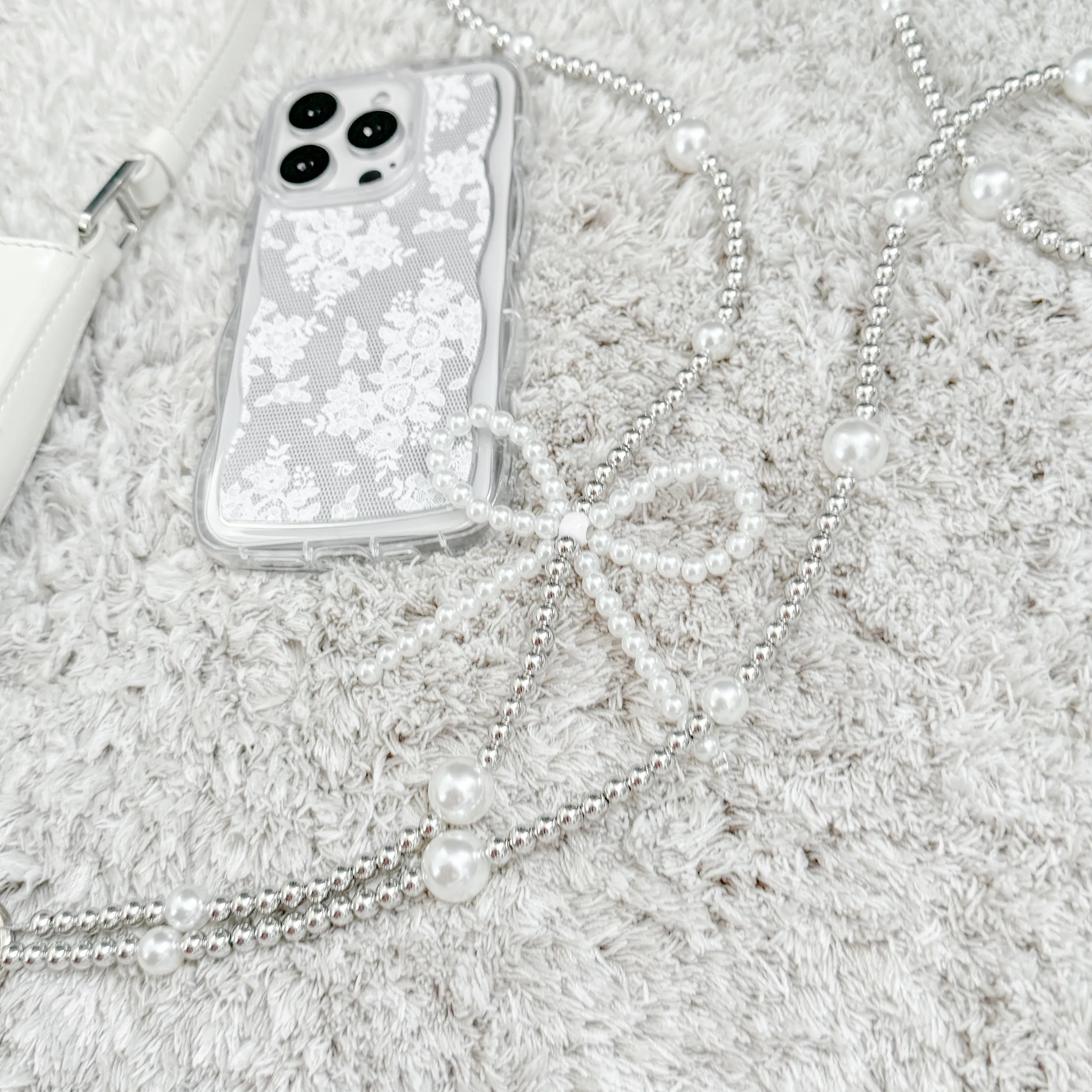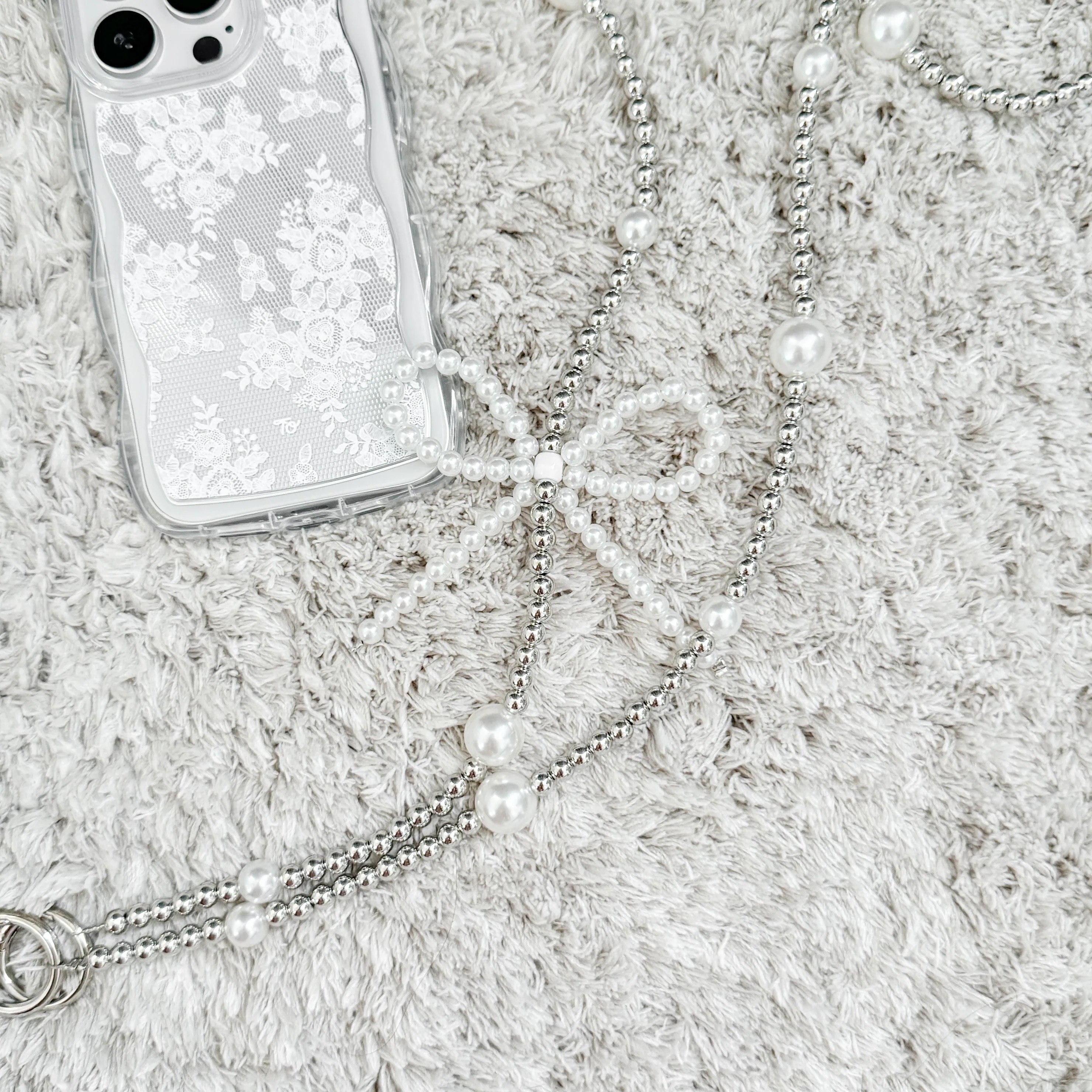 Long Phone Strap Set|Silver Beads with Pearl Ribbon